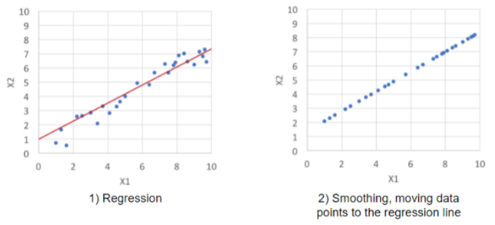 Denoising data Binning β populating bins of similar data and leveling each bin locally (averaging out values for each bin so theyβre the same) Linear regression β searching the best line that can adapt attributes to favor previsions.