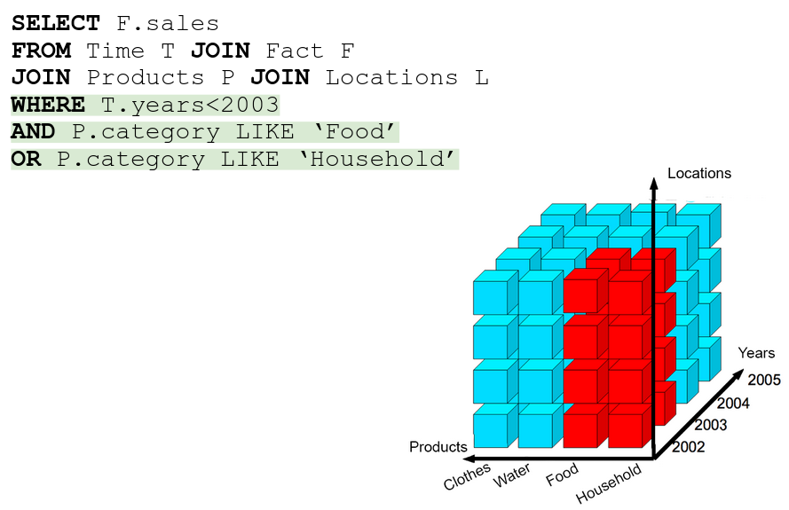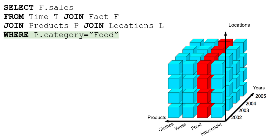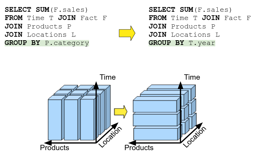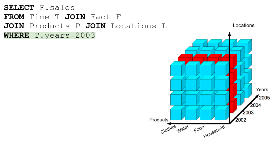 SELECT SUM(F.vendite) FROM Time T JOIN Fatto F GROUP BY T.year <---- WHERE T.year = 2018Pivot β rotation of the cube, basically changing the group by